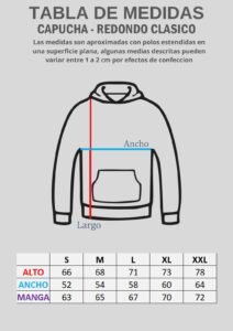 Las imagenes mostradas son de referencia, hechas desde nuestros hoodies. Si prefieres un fit más suelto en nuestros hoodies puedes elegir una talla más a la sugerida según tu altura. Estas medidas son un aproximado del tamaño real, pueden variar ligeramente por procesos de confección.